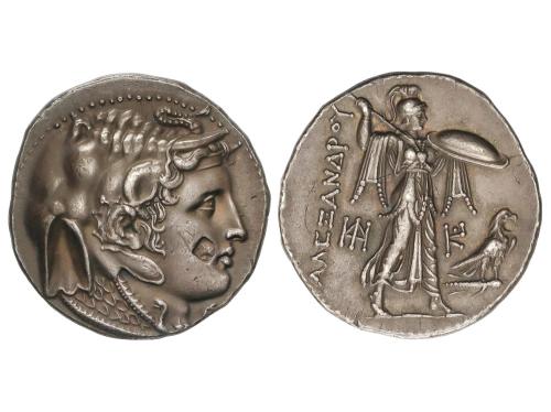 MONEDAS GRIEGAS. Tetradracma. 305-285 a.C. PTOLOMEO I SOTER. EGIPTO. Anv.: Cabeza de Alejandro Magno a derecha, cubierta con piel de elefante. Resello en mejilla. Rev.: ΑΛΕΞΑΝΔΡΟΥ. Atenea en pie a derecha, en el campo monogramas HDI y KE, águila. 15,61 grs. Bonita pátina de colección antigua. BELLA. Se-7750 var. EBC.
