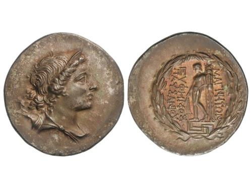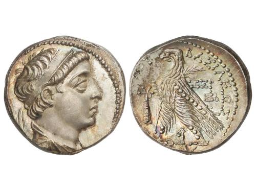 MONEDAS GRIEGAS. Tetradracma. 129-125 a.C. DEMETRIO II. TIRO. REINO SELÉUCIDA. Anv.: Busto diademado a derecha. Rev.: Águila en pie a izquierda sobre proa, alrededor leyenda, monogramas y clava. 14,21 grs. Bella pátina y brillo original. MUY BONITA. HGC 9-970; Se-7105. EBC+.