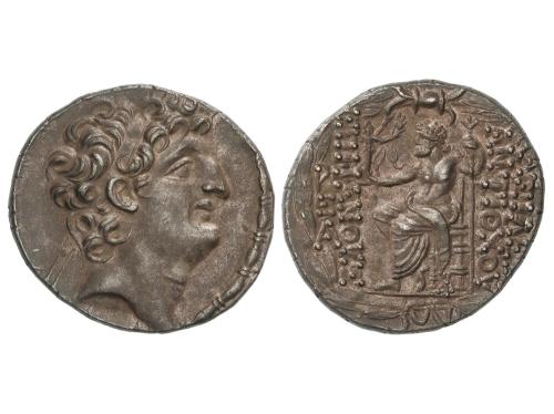 MONEDAS GRIEGAS. Tetradracma. 109-96 a.C. ANTÍOCO VIII. REINO SELÉUCIDA. ANTIOQUÍA AD ORONTEM. Anv.: Busto laureado de Antíoco VIII a derecha. Rev.: Zeus sentado a izquierda con nike en mano. Alrededor leyenda. 16,14 grs. Bonita pátina oscura de colección antigua. HGC 9-1200; Se-7145 Sim. EBC.