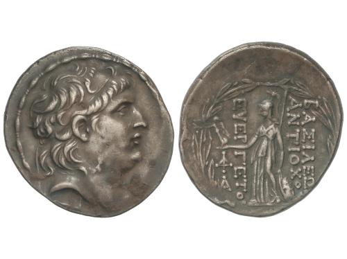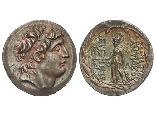 MONEDAS GRIEGAS. Tetradracma. 138-129 a.C. ANTIOCO VII. REINO SELÉUCIDA. Anv.: Cabeza diademada a derecha. Rev.: Atenea en pie a izquierda, sosteniendo a Nike, delante y detrás leyenda. 16,48 grs. Bonita pátina de colección antigua irisada. HGC 9-1069; Se-7092 Sim. EBC.
