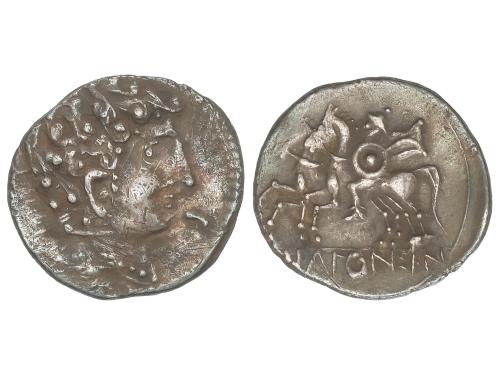 MONEDAS HISPÁNICAS. Denario. 120-20 a.C. BASCUNES (PAMPLONA). Anv.: Cabeza barbada a derecha, detrás leyenda ibérica BeNCoDa. Rev.: Jinete con espada a derecha, debajo leyenda ibérica. 3,41 grs. Pátina. AB-215; ACIP-1630. MBC+.