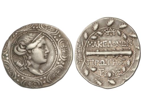 MONEDAS GRIEGAS. Tetradracma. 158-149 a.C. AMPHIPOLIS. MACEDONIA. Anv.: Escudo Macedonio, en el centro busto de Artemis a derecha, con arco y carcaj. Rev.: Clava a derecha, encima un monograma, debajo dos, a izquierda fulmen, leyenda en el campo. 16,32 grs. Cy-1435; HG 3 part I-1103; Se-1386. MBC.