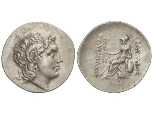 MONEDAS GRIEGAS. Dracma. 305-281 a.C. LISÍMACO. REINO DE TRACIA. Anv.: Cabeza de Alejandro Magno a derecha con el cuerno de Amón. Rev.: ΒΑΣΙΛΕΩΣ / ΛΥΣΜΑXΟΥ. Atenea sentada a izquierda sosteniendo a Nike, alrededor monograma y leyenda. 16,89 grs. (Leves golpecitos). MUY RARA. Muller-No cat. SNG Copenhagen-No cat. Aparentemente no referenciada. MBC+.