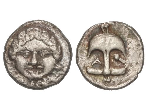 MONEDAS GRIEGAS. Dracma. 450-400 a.C. APOLONIA PONTIKA. Anv.: Cabeza de Gorgona de frente. Rev.: Ancla. 2,88 grs. Se-1655. MBC+.