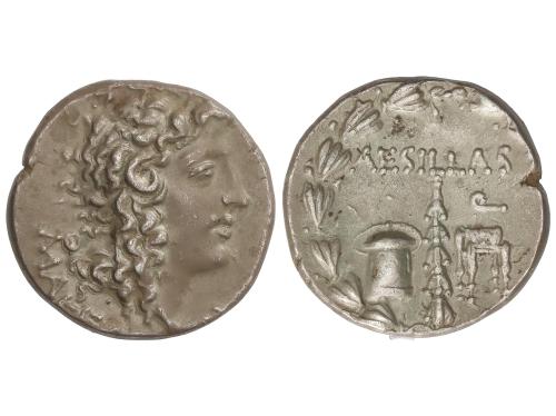 MONEDAS GRIEGAS. Tetradracma. 93-88 a.C. PROVINCIA ROMANA. AESILLAS como QUAESTOR. MACEDONIA. Anv.: Cabeza de Alejandro Magno con los cuernos de Ammon a derecha. Rev.: AESILLAS. Maza entre hucha y silla de Cuestor, en el campo P tumbada, todo dentro de corona de laurel. 15,68 grs. Leve pátina. HGC 3-1110. EBC.