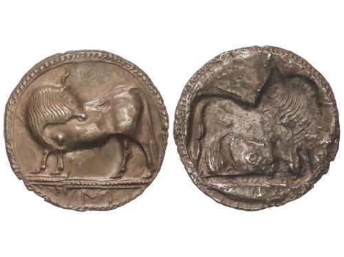 MONEDAS GRIEGAS. Estátera. 400-350 a.C. ISTROS. Anv.: Dos cabezas masculinas de frente, una derecha y otra invertida. Rev.: Águila a izquierda atacando a delfín, encima leyenda. 5,61 grs. Cospel pequeño. Se-1669. EBC-.