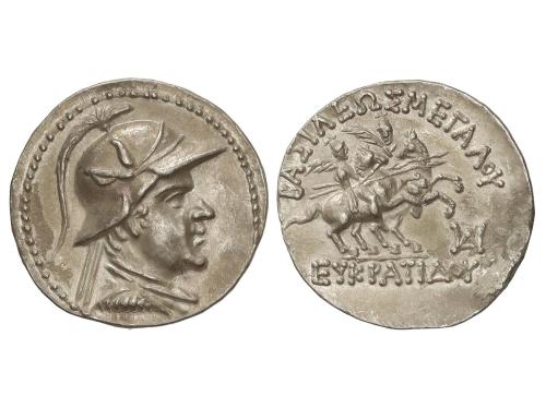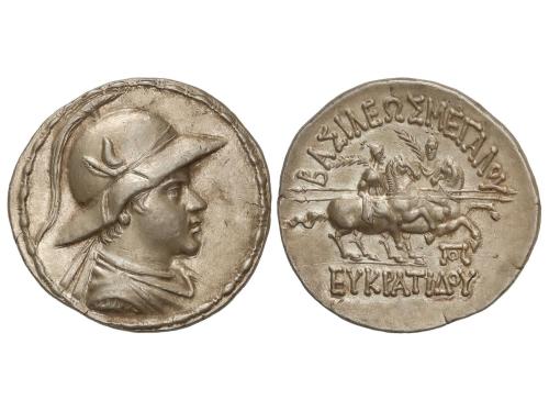MONEDAS GRIEGAS. Tetradracma. 170-145 a.C. EUKRATIDES I. BACTRIA. Anv.: Busto con casco a derecha adornado de oreja y cuerno de toro. Rev.: BAΣIΛEΩΣMEΓAΛOY EYKPATIΔOY. Los Dióscuros a caballo a derecha con lanza y palma, a derecha monograma ΠO. 16,89 grs. Muy bella con restos de brillo original en reverso. RARA ASÍ. Bopearachchi-143; HGC 12-131; SNG ANS-469/71. EBC+.