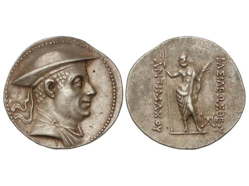 MONEDAS GRIEGAS. Tetradracma. 180-170 a.C. ANTIMACO I. BACTRIA. Anv.: Busto diademado, drapeado y coracero a la derecha, portando kausia. Rev.: ΒΑΣΙΛΕΩΣ ΘΕΟΥ ANTIMAXOY. Poseidón de pie, de frente, con el tridente en la mano derecha y la palma con cintas en la izquierda; en el campo interior derecho, monograma. 16,92 grs. Muy bella. RARA ASÍ. Bopearachchi-248; HGC 12-106; SNG ANS 9-274/277. EBC.