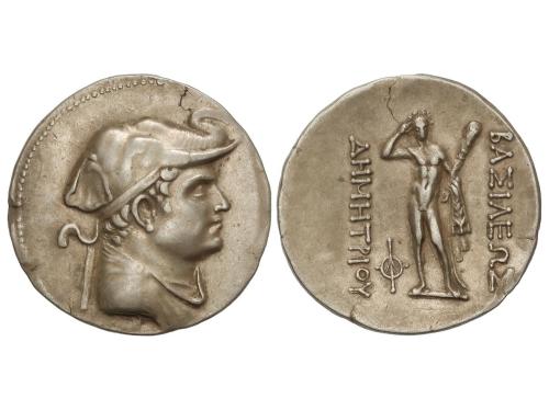 MONEDAS GRIEGAS. Tetradracma. 200-185 a.C. DEMETRIO I. BACTRIA. Anv.: Busto diademado y drapeado hacia la derecha, con casco de cuero de elefante. Rev.: ΒΑΣΙΛΕΩΣ ΔΗΜΗΤΡΙΟΥ. Heracles de pie de frente, con una corona en la mano derecha y un garrote y una piel de león en el brazo izquierdo, a su izquierda monograma. 17,05 grs. (Ínfimas grietas). Muy bella. RARA ASÍ. Bopearachchi-109; HGC 12-63; SNG ANS 9-186/192. EBC/EBC-.