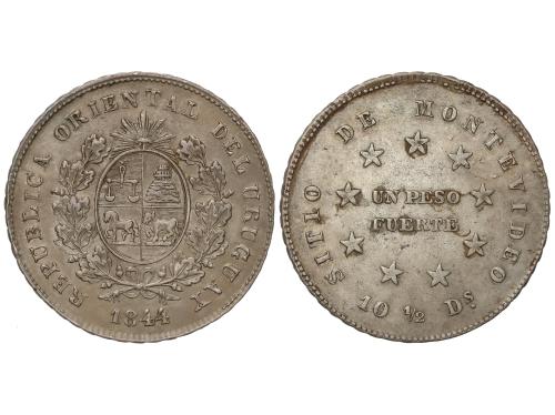 URUGUAY. 1 Peso Fuerte. 1844. SITIO DE MONTEVIDEO. 26,57 grs. Ligera pátina. MUY RARA. KM-5. Tirada: 1.500 piezas. EBC-.