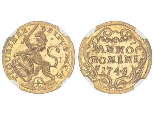 SUIZA. 1/4 Ducat. 1748. ZURICH. Encapsulada por NGC MS63 (n. 3353638-019). Anv.: León rampante con espada. (Hojitas en anverso). RARA ASÍ. Fr-488a; KM-138. SC. Ex Ira & Larry Goldberg - 06 septiembre 2011, n. 4627.