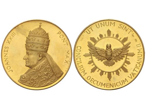 VATICANO. Medalla Segundo Concilio Vaticano. -1962. JOHANNES XXIII. Anv.: JOANNES XXIII PONT MAX. Busto de Juan XXIII con tiara papal. Rev.: UT UNUM SINT CONCILIUM OECUMENICUM VATICANUM II. Paloma con las alas extendidas entre rayos. 49,98 grs. Grabador: Signorini.. (Rayitas en campo). EBC.