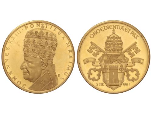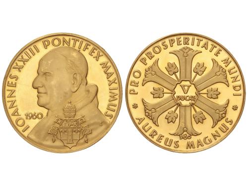 VATICANO. Medalla V Ducat. 1960. JOHANNES XXIII. Anv.: IOANNES XXIII PONTIFEX MAXIMUS. Busto a izquierda. Rev.: PRO PROSPERITATE MUNDI. AUREUS MAGNUS. 17,37 grs. FDC.