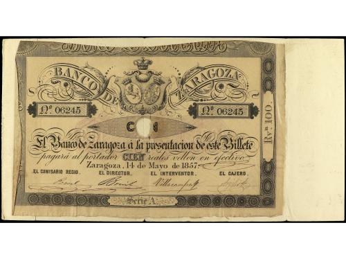ANTIGUOS. 100 Reales de Vellón. 14 Mayo 1857. BANCO DE ZARAGOZA. Serie A. Sin matriz y con firmas. Pegado por el margén derecho en presentación original del BANCO DE CRÉDITO DE ZARAGOZA a sus cliente por el nuevo año de 1932. (Taladro central). Ed-126A. MBC.