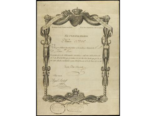 ANTIGUOS. Vale Real. Por 200 Pesos de a 128 Cuartos. 1 Enero 1824. FERNANDO VII. REAL CAJA DE AMORTIZACIÓN. MADRID. Nº 39746. Impreso en doble folio con marca de agua `VALE REAL NO CONSOLIDADO´ y sello en seco de Fernando VII. Tampón ovalado `Legitimado en 1826´ y rectangular `Presentado en 1827´. MUY RARO. Filabo - página 84. MBC+.