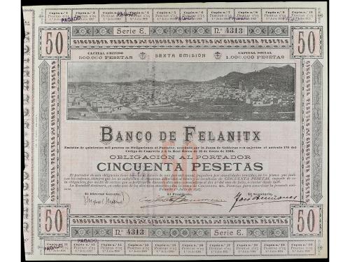 ANTIGUOS. Obligación al portador 50 Peseta. 1 Julio 1927. BANCO DE FELANITX (Mallorca). Serie E. Cobo pág. 82. EBC.