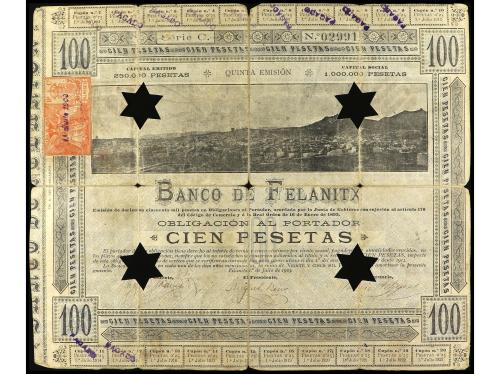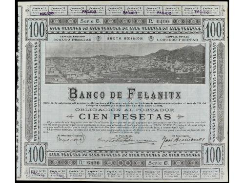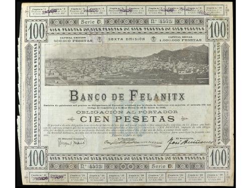ANTIGUOS. Obligación al portador 100 Pesetas. 1 Julio 1903. BANCO DE FELANITX (Mallorca). Serie C. Taladros en forma de estrella de 5 puntas. (Roturas, reparaciones con adhesivo). RARO. Cobo pág. 87. BC+.