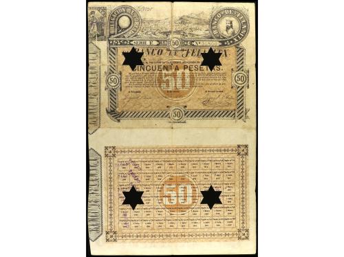 ANTIGUOS. Obligación al portador 50 Pesetas. 1 Julio 1889. BANCO DE FELANITX (Mallorca). Serie E. Taladros en forma de estrella de 5 puntas y cupones. RARO. Cobo pág. 86. MBC-.