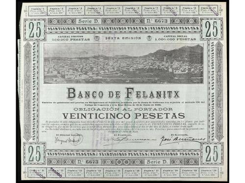ANTIGUOS. Obligación al portador 25 Pesetas. 1 Julio 1915. BANCO DE FELANITX (Mallorca). Serie D. Taladros en forma de estrella de 5 puntas. (Roturas, reparaciones con adhesivo). RARO. Cobo pág. 88. BC+.