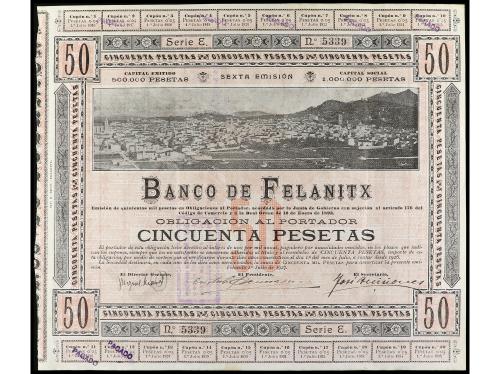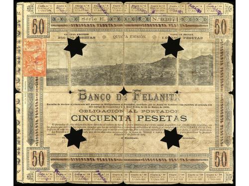 ANTIGUOS. Obligación al portador 50 Pesetas. 1 Julio 1903. BANCO DE FELANITX (Mallorca). Serie E. Taladros en forma de estrella de 5 puntas. (Roturas y reparaciones con cinta adhesiva). RARO. Cobo pág. 87. MBC-.