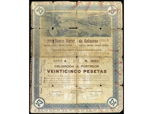 ANTIGUOS. Obligación al portador 25 Pesetas. 1 Julio 1923. BANCO AGRARIO DE BALEARES (Mallorca). Serie A. (Roturas y reparaciones con cinta adhesiva). Cobo pág. 103. BC.