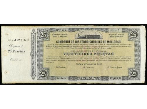 ANTIGUOS. Obligación al portador 25 Pesetas. 1 Julio 1885. COMPAÑÍA DE LOS FERROCARRILES DE MALLORCA. Con matriz a izquierda. (Perforaciones de archivo en matriz, bordes oxidados). Cobo pág. 111. EBC-.