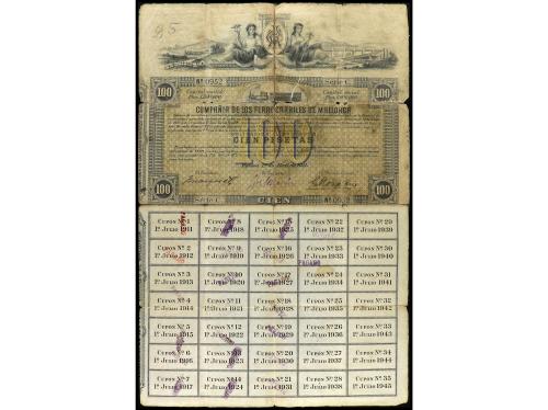 ANTIGUOS. Obligación al portador 100 Pesetas. 1 Abril 1911. COMPAÑÍA DE LOS FERROCARRILES DE MALLORCA. Sin matriz y con cupones. (Reparaciones con adhesivo, roturas). Cobo pág. 117. BC+.