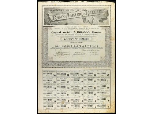 ANTIGUOS. Acción 500 Pesetas. 22 Mayo 1943. BANCO AGRARIO DE BALEARES (Mallorca). Con cupones. (Manchitas del tiempo). Cobo pág. 156. EBC-.