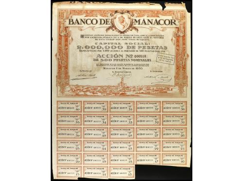 ANTIGUOS. Acción de 500 Pesetas. 8 Marzo 1930. BANCO DE MANACOR (Mallorca). Con cupones, alguno recortado. (Roturas en margen). Cobo-Nocita. MBC+.