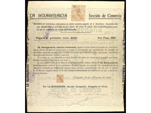 ANTIGUOS. Pagaré por 250 Pesetas. 20 Noviembre 1908. LA SEXAGENARIA. CIUDADELA (Menorca). Sección de Comercio. Pagaré núm. 0038. EBC.