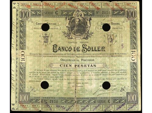 ANTIGUOS. Obligación al portador 100 Pesetas. 1 Enero 1910. BANCO DE SOLLER (Mallorca). Serie C. Al dorso vista panorámica del pueblo. Taladros en forma de círculo. (Roturas y reparaciones con cinta adhesiva). RARO. Cobo pág. 97. BC+.