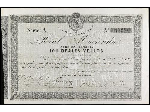 ANTIGUOS. 100 Reales de Vellón. 1 Noviembre 1873. CARLOS VII, PRETENDIENTE. BAYONA. Bono del Tesoro. Serie A. Ed-210. EBC.