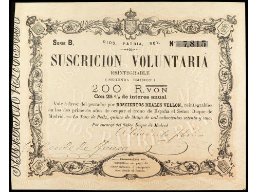 ANTIGUOS. Suscrición Voluntaria 200 Reales de Vellón. 30 Mayo 1870. CARLOS VII, PRETENDIENTE. LA TOUR DE PEILZ. Ed-197. EBC.