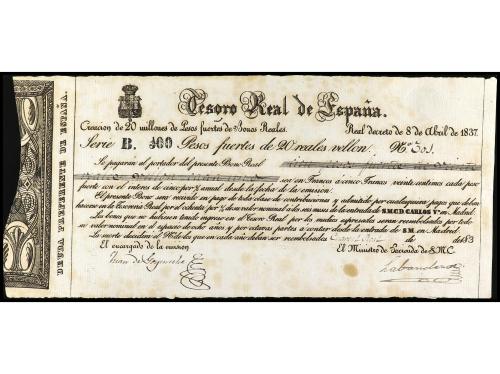ANTIGUOS. 100 Pesos Fuertes de 20 Reales de Vellón. 8 Abril 1837. CARLOS V, PRETENDIENTE. TESORO REAL. Billete completo con la matriz. Ed-22. EBC.