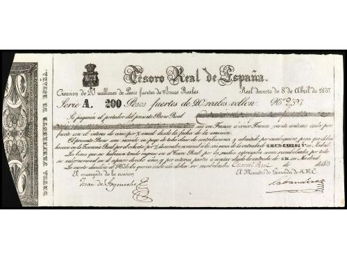 ANTIGUOS. 200 Pesos Fuertes de 20 Reales de Vellón. 8 Abril 1837. CARLOS V, PRETENDIENTE. TESORO REAL. Billete completo con la matriz. Ed-23. EBC-.