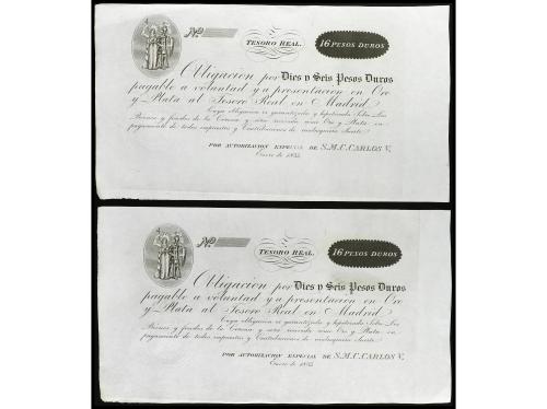 ANTIGUOS. Lote 2 billetes 16 Pesos Duros. Enero 1835. CARLOS V PRETENDIENTE. TESORO REAL. MADRID. Ed-19. EBC.