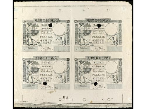 ANTIGUOS. Lote 4 Pruebas anverso 100 Pesetas. 1 Julio 1903. Fogonero. Con matriz. Un taladro en cada una. En bloque de cuatro sin cortar. Ed-310Pa. EBC-.