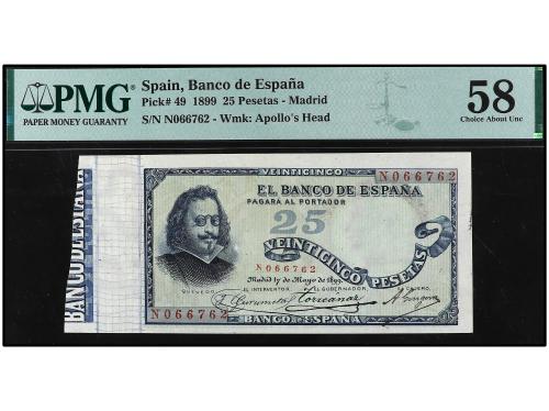 BANCO DE ESPAÑA. 25 Pesetas. 17 Mayo 1899. Precintado y garantizado por PMG como 58 CHOICE ABOUT UNCIRCULATED (nº 1916701-001). Quevedo. Serie N. RARO en esta excepcional calidad. Ed-306a. EBC+.