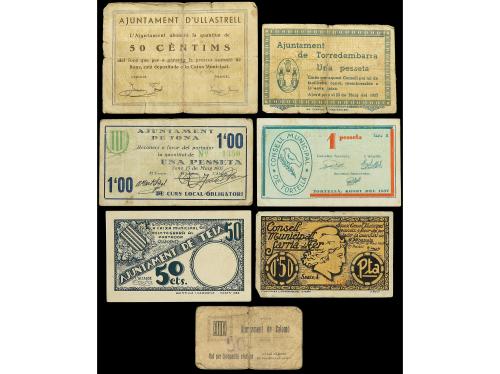 CATALUNYA. Lote 7 billetes. SARRIA DE TER, SALOMÓ, TEIÀ, TONA, TORREDEMBARRA, TORTELLÀ, ULLASTRELL. A EXAMINAR. AT-2292, 2264, 2450, 2499, 2540, 2575, 2610. MBC- a MBC+.
