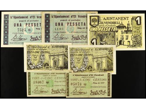 CATALUNYA. Lote 7 billetes 25 (4) y 1 Pesseta (3). Aj. d´ EL VENDRELL. Todos los del ajuntament con variantes. AT-2710/2713. MBC- a EBC. Ex Aureo & Calicó `Martí Cot II´ - 16 marzo 2022, n. 1601.