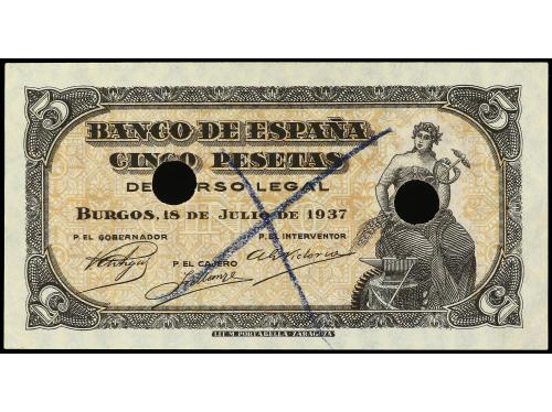 ESTADO ESPAÑOL. 5 Pesetas. 18 Julio 1937. Portabella. Serie A. Sin numeración y con dos taladros centrales. Tachado en forma de X con cera azul en anverso. (Esquinas algo rozadas, punto de aguja sobre E de gobernador). Ed-424T. SC-.