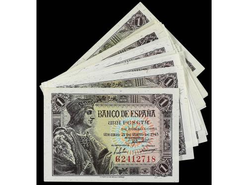 ESTADO ESPAÑOL. Lote 15 billetes 1 Peseta. 13 Febrero 1943. Fernando El Católico. Sin Serie, Series A, B, C, D, E, F, G, H, I, J, K, L, M, N. A EXAMINAR. Ed-447, 447a. EBC- a SC.
