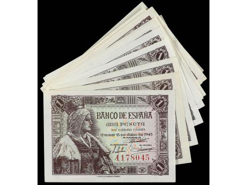 ESTADO ESPAÑOL. Lote 14 billetes 1 Peseta. 15 Junio 1945. Isabel La Católica. Sin Serie y Series A, B, C, D, E, F, G, H, I, J, K, L, M. A EXAMINAR. Ed-448, 448a. EBC- a SC.