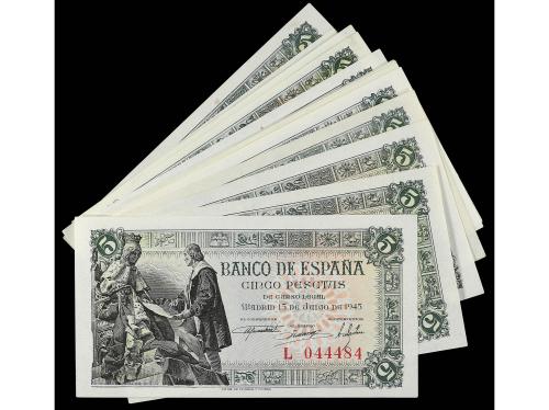 ESTADO ESPAÑOL. Lote 10 billetes 5 Pesetas. 13 Febrero 1943. Isabel La Católica. Diferentes series. EXAMINAR. Ed-446, 446a. EBC- a SC.