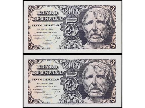 ESTADO ESPAÑOL. Lote 2 billetes 5 Pesetas. 12 Abril 1947. Séneca. Sin serie. Pareja correlativa. Ed-454. SC.
