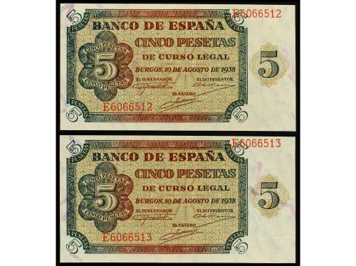 ESTADO ESPAÑOL. Lote 2 billetes 5 Pesetas. 10 Agosto 1938. Pareja correlativa. Edd-435a. SC.