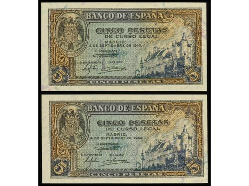 ESTADO ESPAÑOL. Lote 2 billetes 5 Pesetas. 4 Septiembre 1940. Alcázar de Segovia. Serie A. Pareja correlativa. Ed-443. EBC.