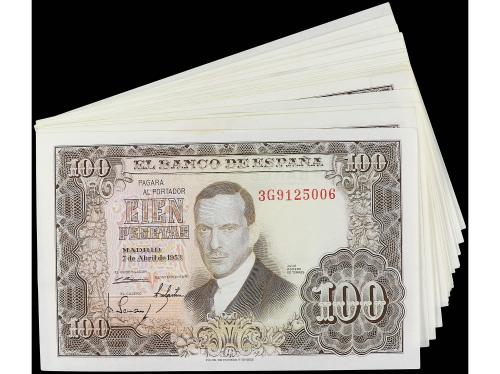 ESTADO ESPAÑOL. Lote 22 billetes 100 Pesetas. 7 Abril 1953. Romero de Torres. Serie 3A, 3B, 3C, 3D, 3E, 3F, 3G, 3H, 3I, 3J, 3K, 3L, 3M, 3N, 3P, 3Q, 3R, 3S, 3T, 3U, 3V, 3W. A EXAMINAR. Ed-464c. EBC- a SC.