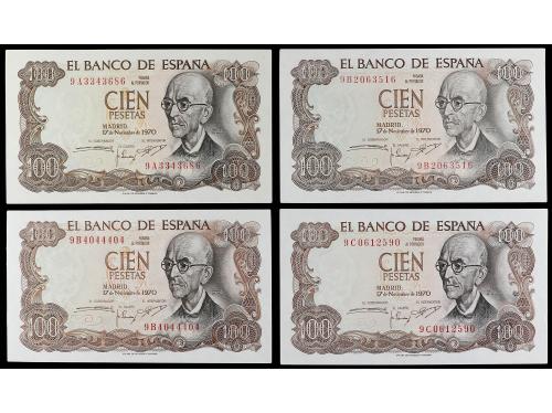 ESTADO ESPAÑOL. Lote 4 billetes 100 Pesetas. 17 Noviembre 1970. Falla. Numeración especial 9A, 9B (2) y 9C. (Arruguitas). Ed-472d. SC-.