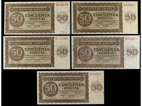 ESTADO ESPAÑOL. Lote 5 billetes 50 Pesetas. 21 noviembre 1936. Series M, O, P, Q, R. A EXAMINAR. Ed-421. MBC+ a EBC.